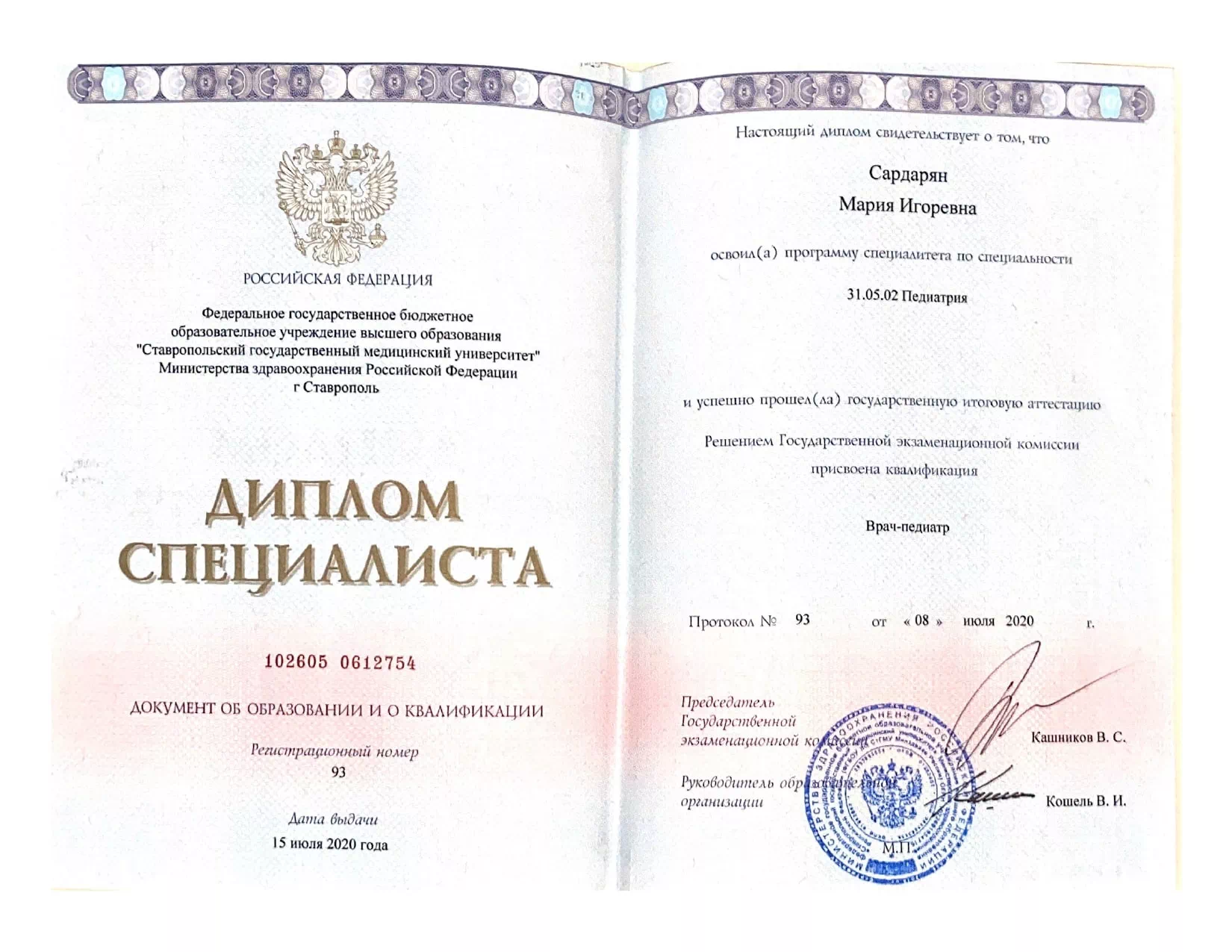 • 2020 — Ставропольский государственный медицинский университет (квалификация: врач-педиатр);